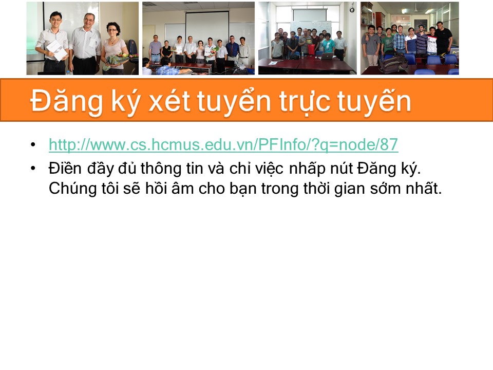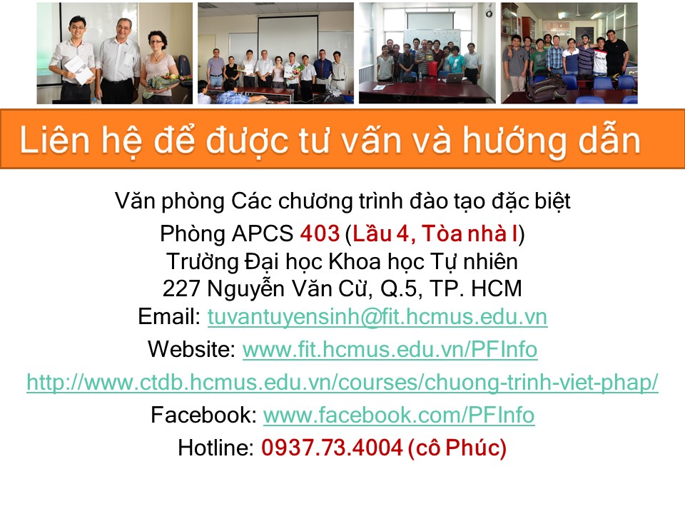 • Nộp trực tiếp hoặc gửi thư qua đường bưu điện về Văn phòng các chương trình đào tạo đặc biệt (Phòng APCS 403, lầu 4 tòa nhà I. 227 Nguyễn Văn Cừ, Quận 5, TP.HCM).