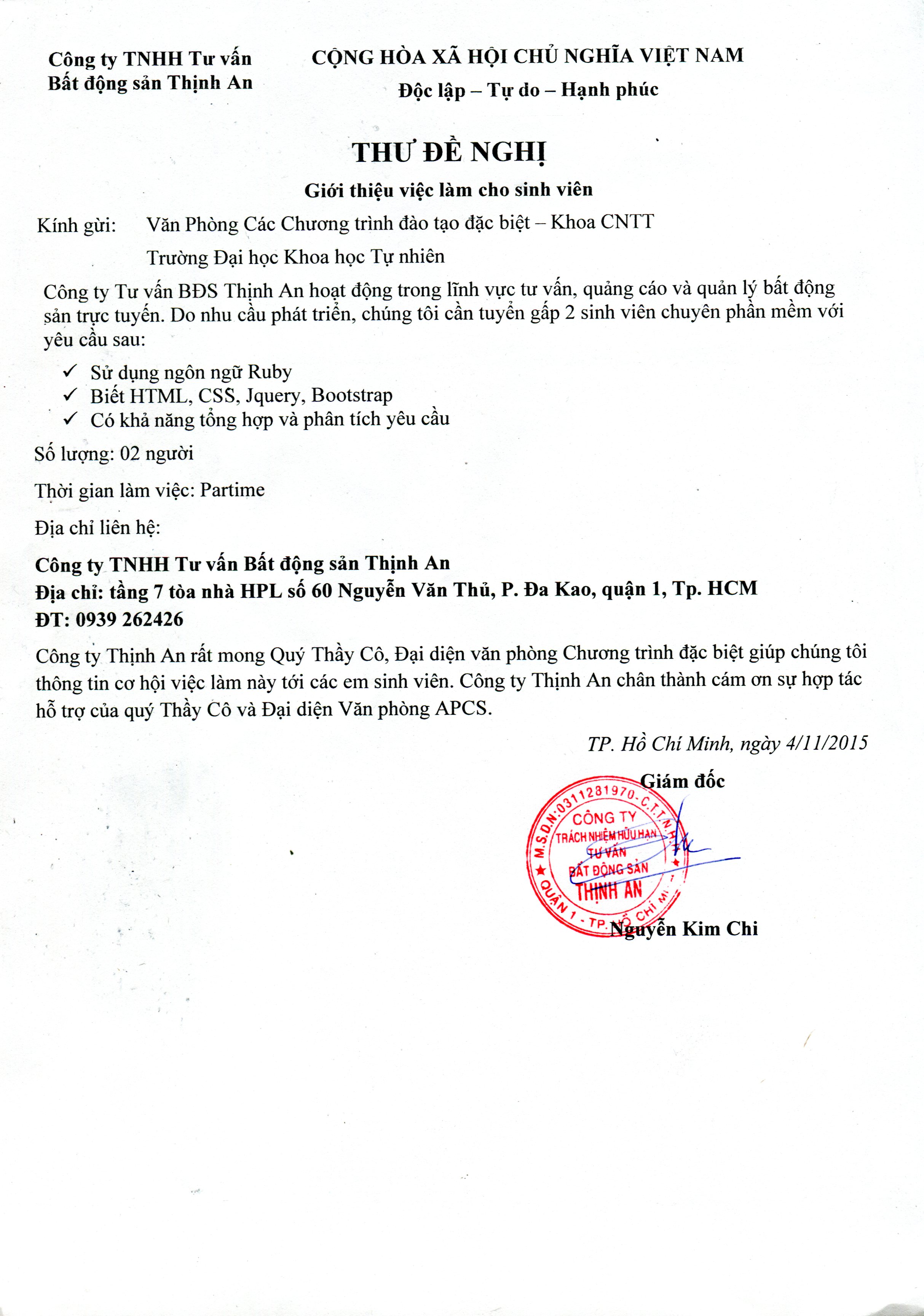 Công ty  Bất Động Sản Thịnh An đang có nhu cầu tuyển dụng 2 sinh viên chuyên về phần mềm, làm việc partime. Các bạn sinh viên quan tâm xem thêm thông tin trong file đính kèm.